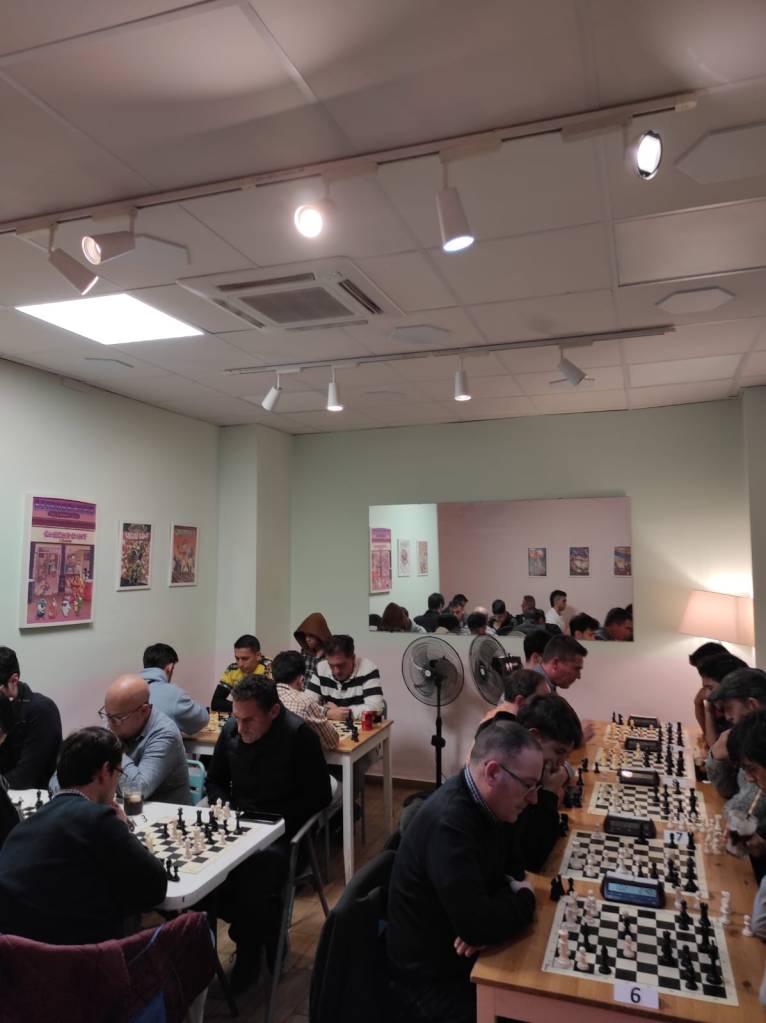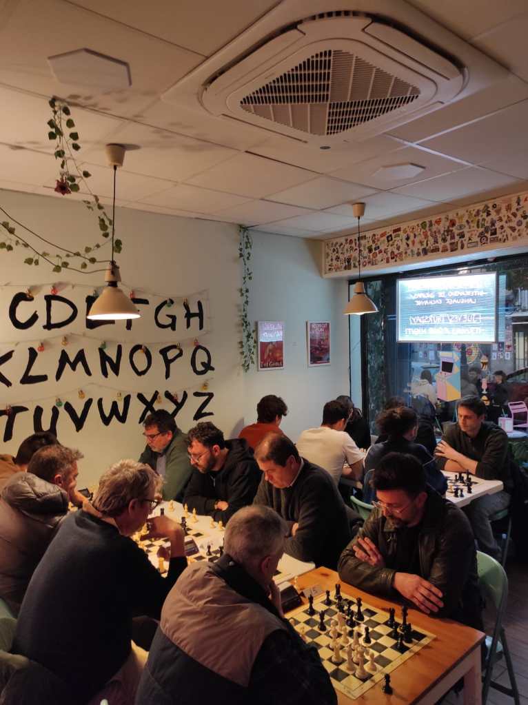 Mucho más se alargó la partida de Carlos. Tanto él como su rival estaban jugando sobre los treinta segundos de incremento, con la presión del encuentro y en una posición afilada donde cualquier error suponía el punto. Afortunadamente para nuestros intereses, la bandera cayó del lado tussamigo, poniendo un empate inesperado ante un rival durísimo (2.5-2.5)